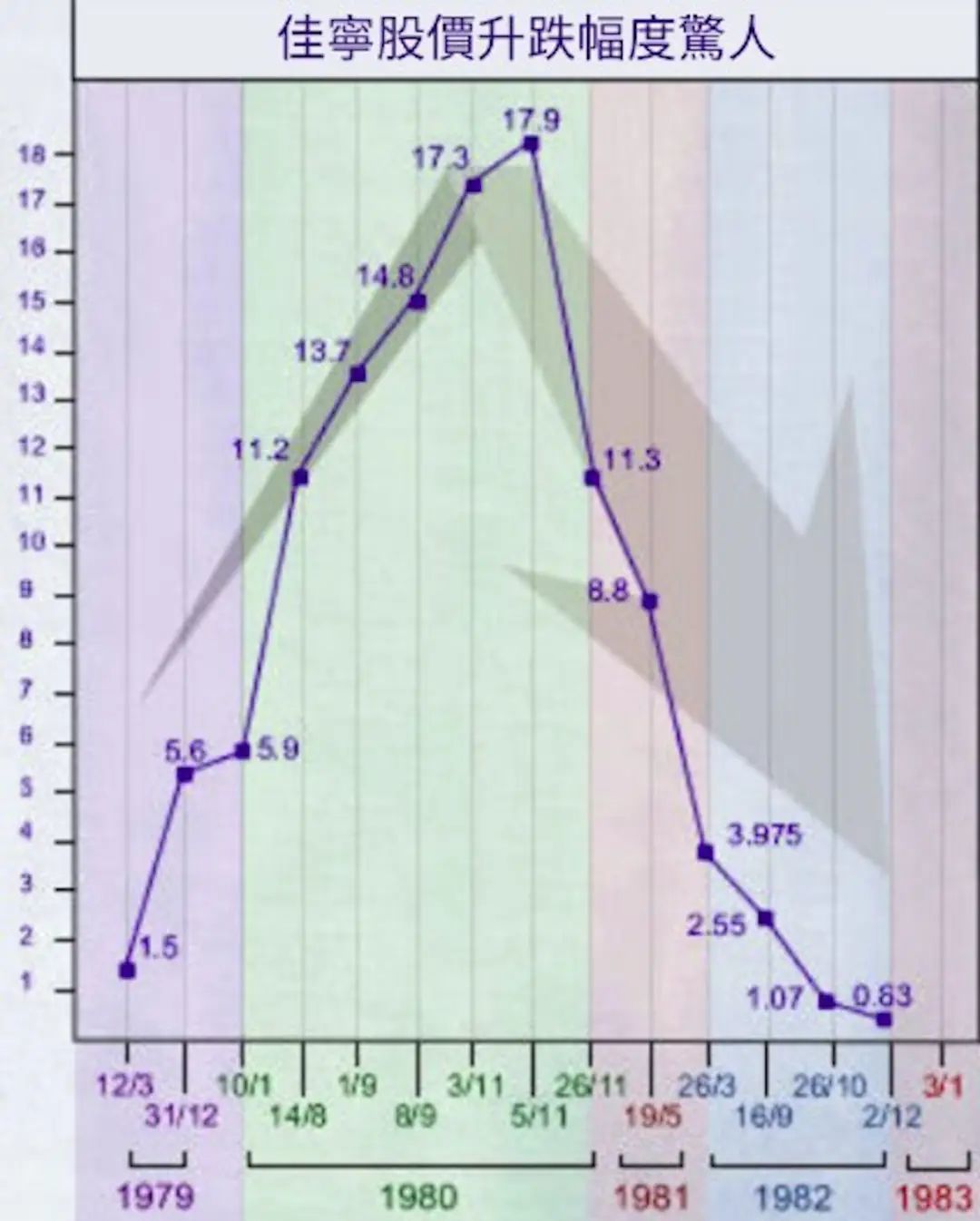 ▲ 1982年,佳宁的股价一泻千里,内部资金周转失灵,佳宁集团被要求清盘。1983年,佳宁集团股票在交易所停盘,数月后佳宁正式清盘,并欠下高达106亿港元的巨债,这是八十年代的一百多个亿啊,背后是千千万万散户们的家破人亡。