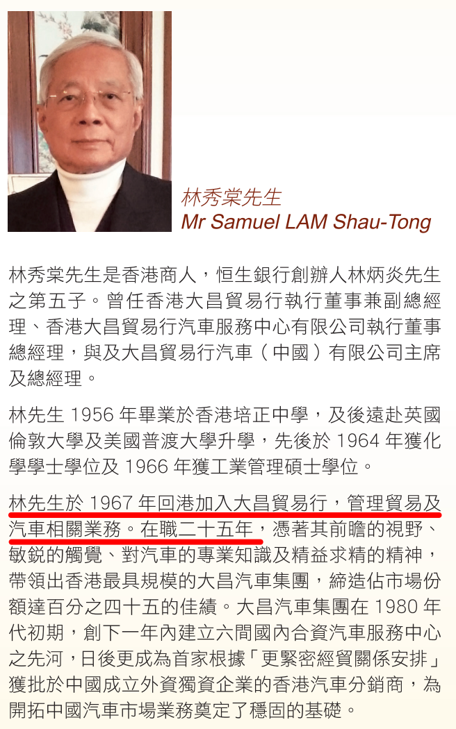 ▲ 为什么说大昌行算是半个林氏家族企业?一是大昌行由恒生元老创办,二是即便彼时林炳炎已离世,大昌行也与林家紧密关联。大昌行最有影响力的话事人何善衡是林秀峰的义父,前面提到的林秀峰四弟林秀棠,大学毕业后即进入大昌行工作,在大昌行内资历深厚、颇具影响力。
