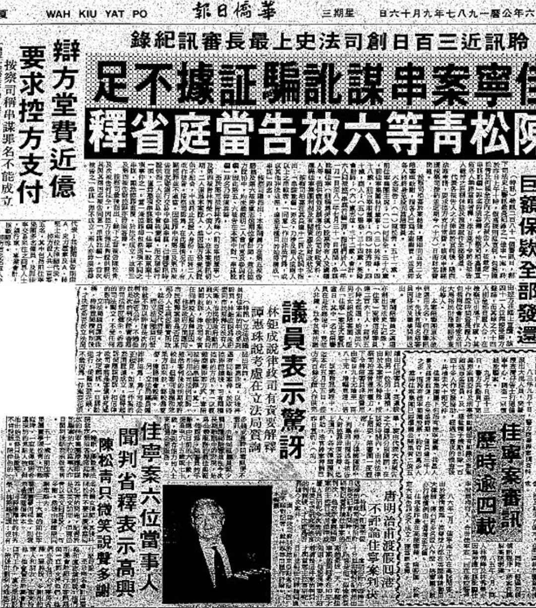 佳宁案是香港司法史上涉案时间最长、投入人力财力最多的大案。1987年,因为证据不足等原因,包括陈松青、林氏兄弟在内涉案的6人均获无罪释放,外界舆论哗然。