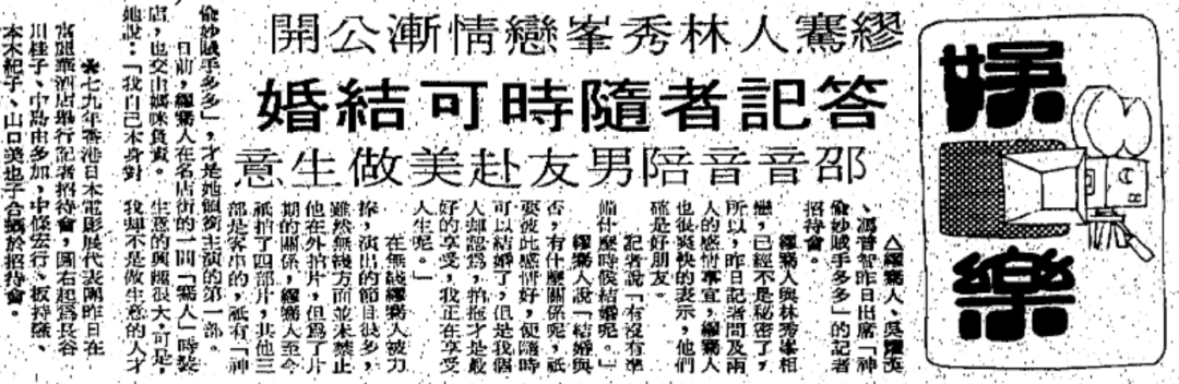 ▲ 1976年林秀峰成为佳视老板,缪骞人入选香港小姐最上镜小姐,同年入行与周润发主演《狂潮》,这部剧与剧中两位主演皆成为当年的大热门。当时已有妻小的林秀峰疯狂追求缪骞人,三天两头登上报纸头版,后来失意之后,仍然记得自己坐名车载美人的风流故事,视为人生得意事,言语甚是轻浮。