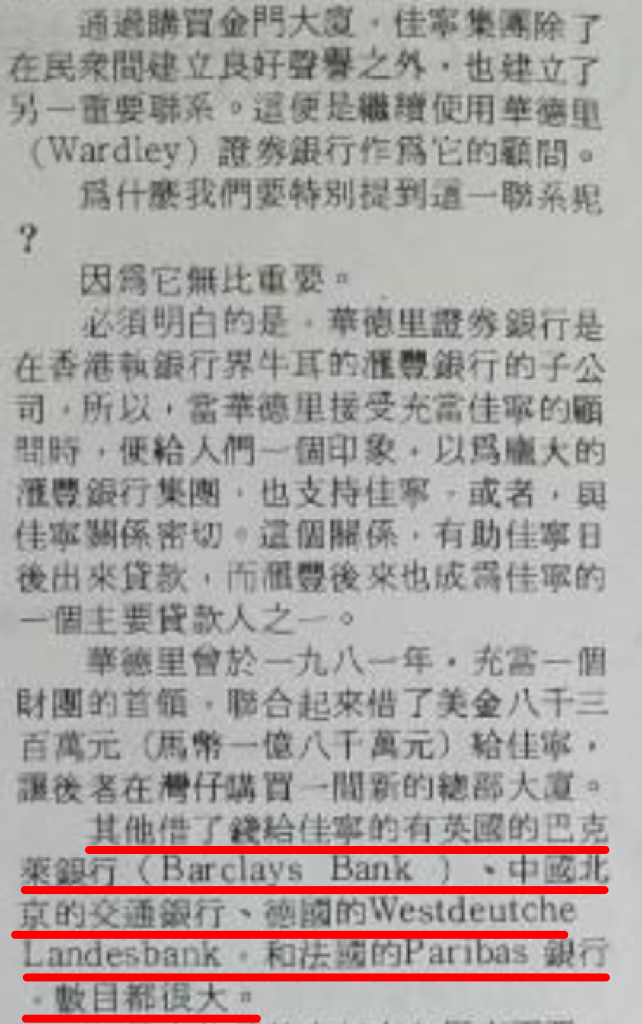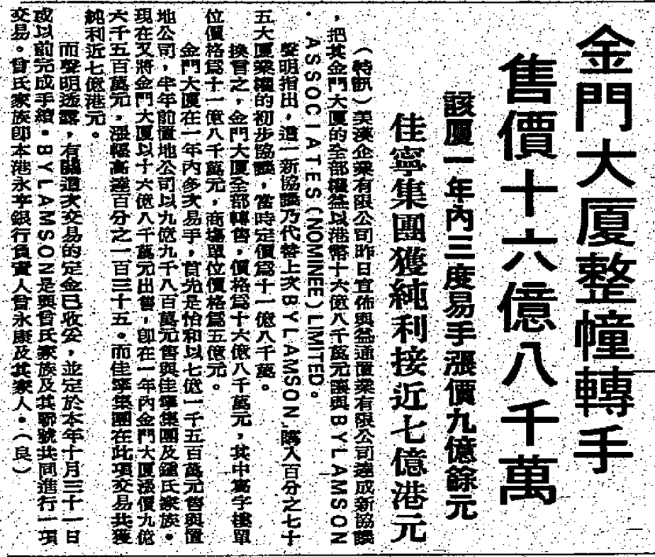 ▲ 当时陈松青以每股近一倍的价格收购美汉,虽然其中疑点重重,但陈松青在1980年通过金门大厦的一买一卖,创造了巨大的利润,"此举赢得人们的信心,人们对佳宁已是有赞无弹"。1980年初金门大厦一役,不仅给陈松青带来巨大的社会声誉,还帮助他结识汇丰银行旗下的证券公司,使其成为佳宁置业的顾问。要知道,彼时林家的恒生银行已被汇丰收购,陈松青大概也是在1980年初与林秀峰结识。1980年9月金门大厦的买家,正是林秀峰与林秀荣兄弟持有的百宁顺(Bylamson)。