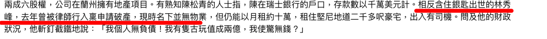▲ 至于林秀峰为什么手握上亿赔偿款,还会在短短2年后宣告破产?林秀峰在得知自己胜诉后,接着向恒辉财务贷款,据说是用于支付这些年打官司的律师费。不过据说在手里无物业、祖产基本败光的情况下,林秀峰还一直维持着从前住大宅、身边司机佣人环绕的贵公子生活,古董案获得的这笔赔偿款,估计也难以补足他欠下的债务。