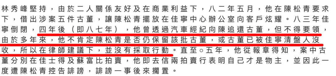 ▲ 时隔20年才想起来追讨当年借给佳宁的5件古董,估计是因为林秀峰也没能预料到,这批古董在20年后竟然能值这么多钱。