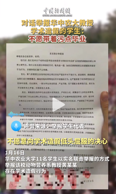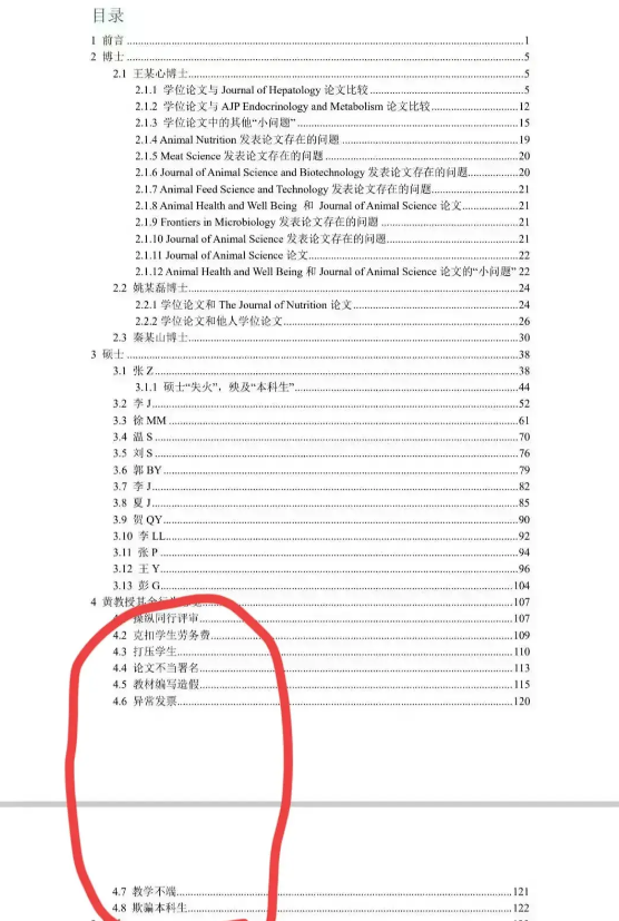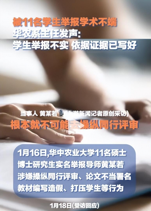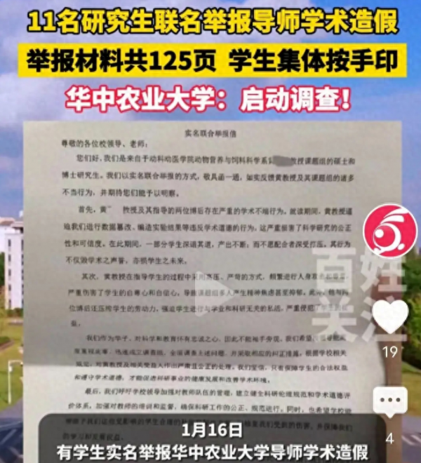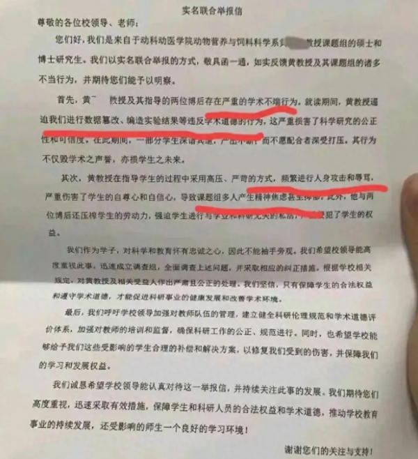 近日在华中农业大学发生了一件匪夷所思的事件,11名在读硕士和博士,用125页材料,联合实名举报了其导师黄教授。