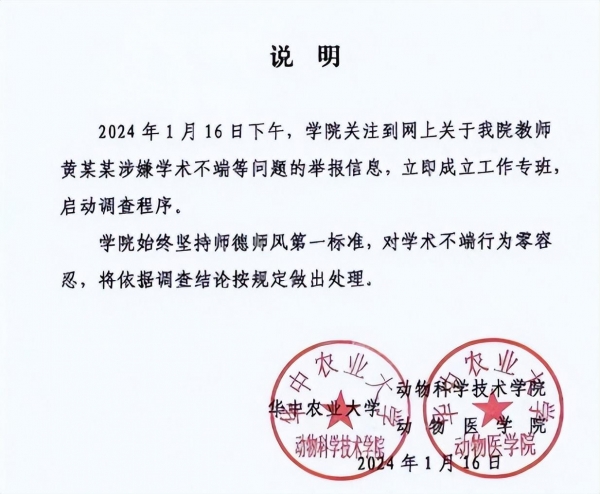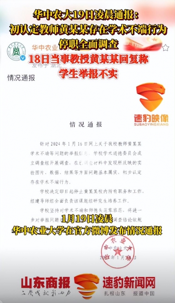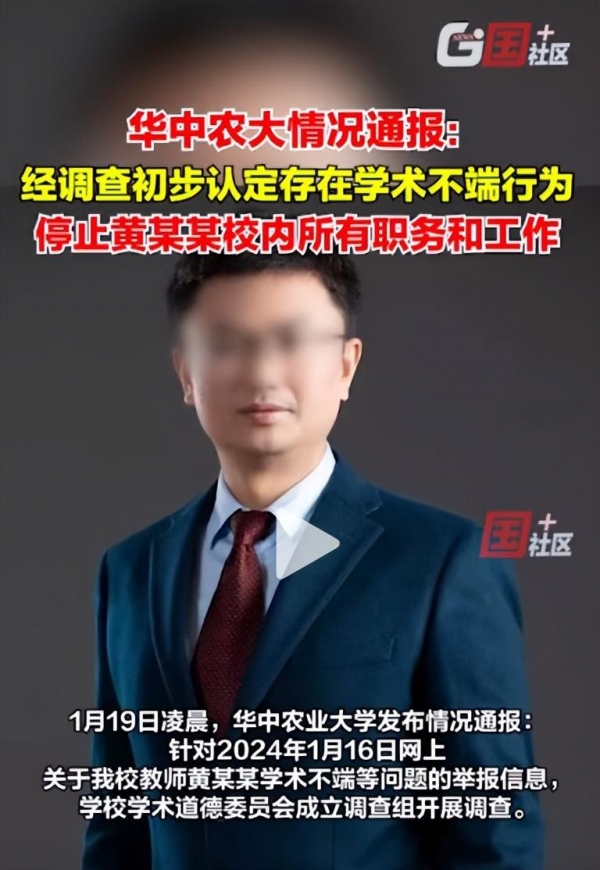 1月19日,在经过约3天的调查后,华中农业大学就学生举报教授涉嫌学术造假事件,给出了最新通告:在已调查材料中发现所反映的实验图片、数据、结果等方面问题基本属实,初步认定黄教授存在学术不端行为,学校即日起停止黄某某校内所有工作和职务。
