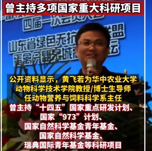 据资料显示,黄教授本名黄飞若,是华中农业大学动物科学技术学院教授、博士生导师、动物营养与饲料科学系主任。