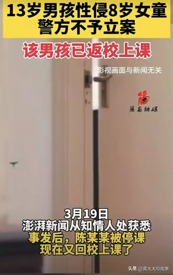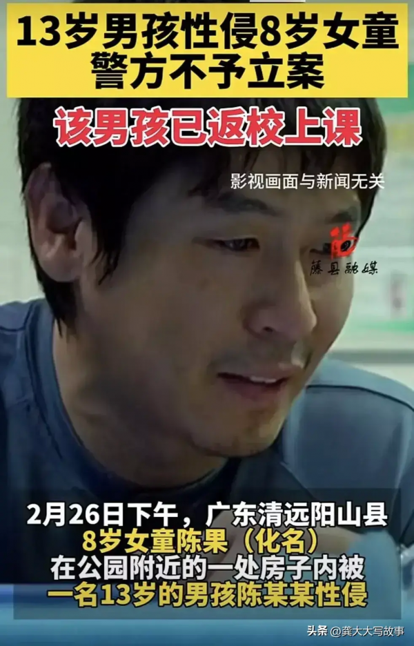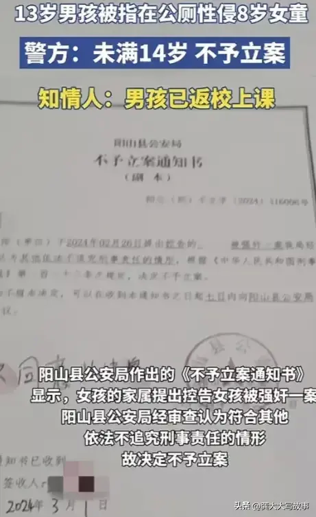 广东清远市阳山县,13岁男孩陈某,性侵8岁女孩,因其未满14岁,警方依法作出,不予立案。13岁陈某,无刑事责任年龄,犯强奸罪,不受刑事处罚。陈某已经返校读书,随后,他被送进专门学校训诫教育。