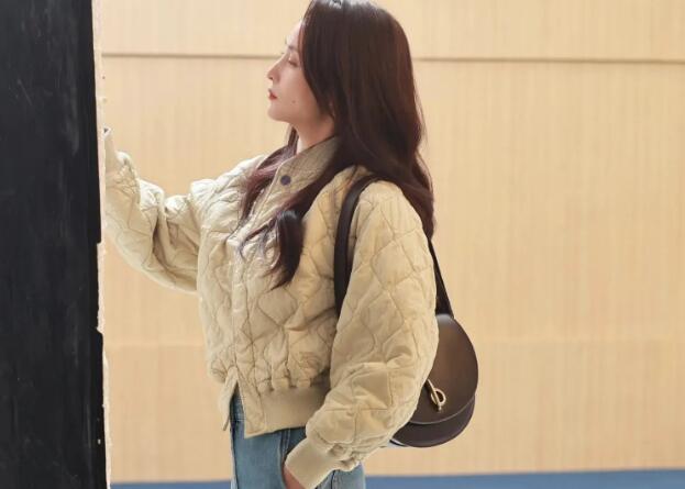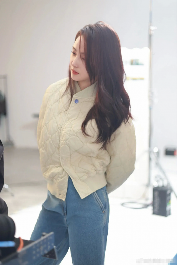 的确,照片中的蒋勤勤身穿米色短款外套,下身搭配天蓝色牛仔阔腿裤,脚踩白色小板鞋,微卷的长发显得十分优雅大气,身材高挑,站在那里宛如大学校园中的师姐,青春洋溢,气质非凡。