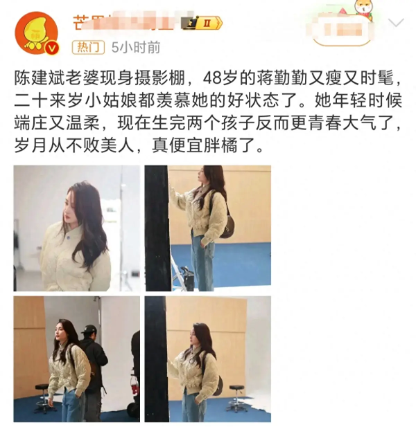 1月29日,有网友晒出了在录音棚偶遇48岁蒋勤勤的照片,该网友称蒋勤勤本人又瘦又时髦,二十来岁的小姑娘都羡慕她的好状态,蒋勤勤年轻的时候端庄又温柔,现在生完孩子了反而更青春大气了,果然岁月从不败美人,真是太便宜胖橘了。