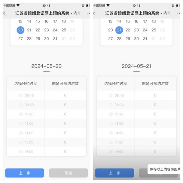 该网友表示,本来想抢"520"登记,中午看的时候还有一个名额,结果填完信息就没有了。然后该网友又定了时间抢"521"的登记预约名额,"被卡出两次再点进去,想要的时间段就没有了。"
