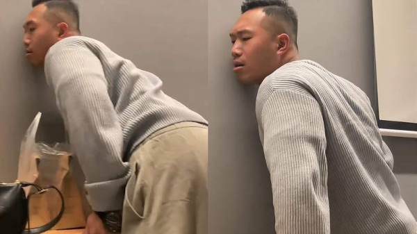 过了一会儿,男子又换了一个地方继续偷听。这一幕让老婆哭笑不得。