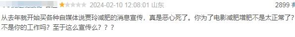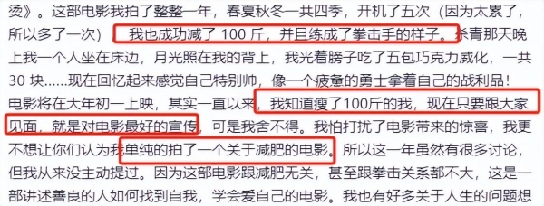 有网友不禁直言,一部电影的宣传,不应该是其剧情、立意、演技、技法之类吗,怎么全部是宣传减肥。纯靠瘦身宣传让人反感。