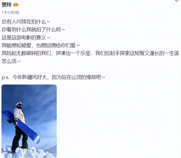 而随后,贾玲更是晒出自己在新疆滑雪站在山顶的图片,并佩文"今年新疆的风好大,因为是站在山顶的缘故吧"
