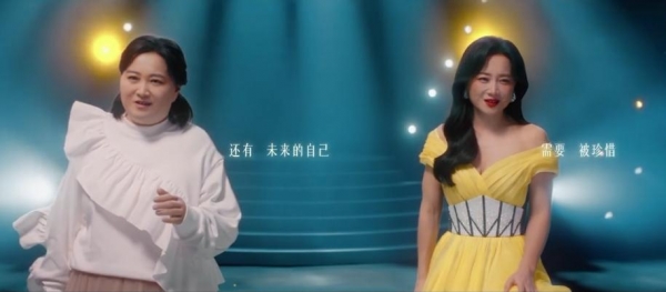 而在第一阶段营销减肥热度逐渐减退之后,贾玲团队又发布了贾玲的MV,身穿黄色礼服梳着大波浪的贾玲在舞台上,和曾经的自己对唱,再次带领电影的热度起飞。