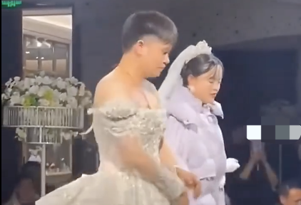 近日,安徽。一对新人结婚当天,新娘在路上出现意外,摔断了手,手臂打上了石膏,没法穿婚纱,于是新郎决定替新娘穿婚纱。