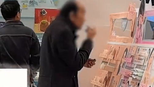 山东一大叔在化妆品店试涂口红, "再也不敢拿试用装涂嘴了"。