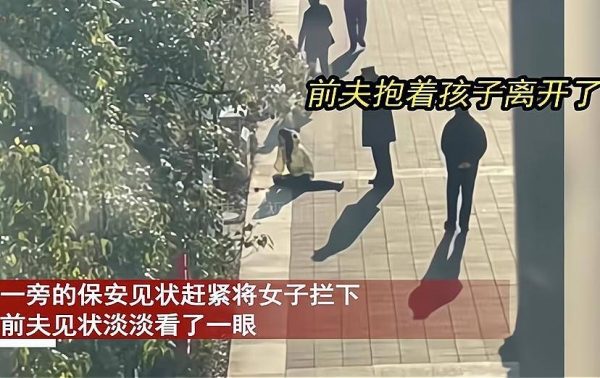 女子望着前夫和孩子的背影,绝望地哭泣。并且做出了过激的举动,用头撞向路边的铁桶,保安大叔看见,赶紧上前阻拦,生怕她弄伤了自己。