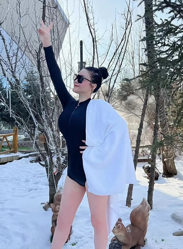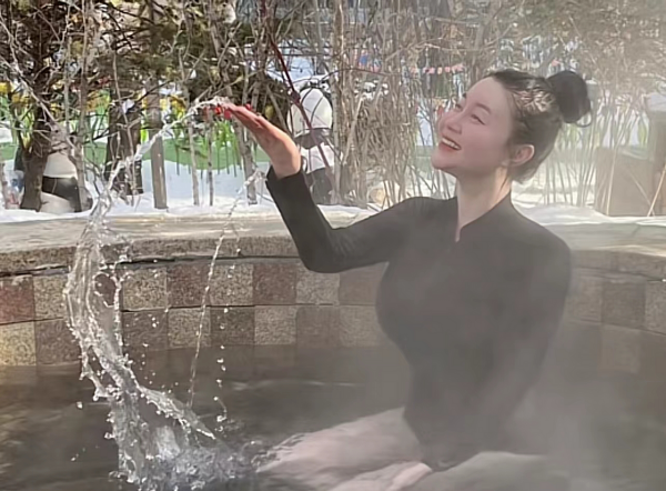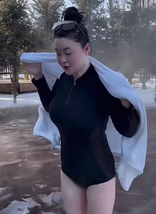 关婷娜在社交媒体上分享了自己在雪乡游玩的视频,视频一开始就是她穿着连衣泳衣泡在雪乡著名的温泉里,温泉雾气腾腾,身穿黑色泳衣的关婷娜则大方地出镜,一边感受着温泉的炙热,一边和粉丝网友互动。