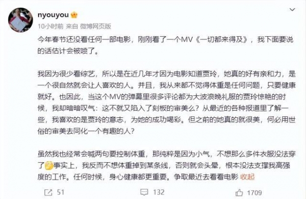 虽然我也经常会喊两句要控制体重,那纯粹是因为小气,不想那么多件衣服没法穿了。事实上,我反而不想体重掉到某条线,否则就会头晕,根本没法支撑我高强度的工作。任何时候,身心健康都更重要。争取最近去看看电影。"
