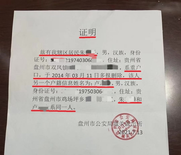 近日,上游新闻记者从接近盘州警方人士处获悉,经调查,朱某平从小拥有两个户口,因其父亲是上门女婿,其中朱某平户籍落在母亲的户口上,卢某金户籍落在父亲的户口上,"之前户口一般由村里上报到镇上,户籍审核划归公安以后,公安机关也没有发现重户口的问题。"