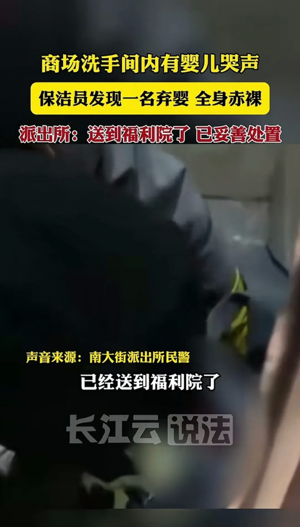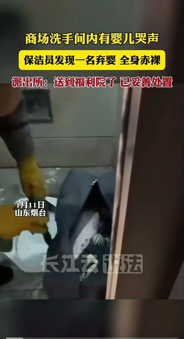 1月11日,烟台某商场一位保洁阿姨正常的打扫卫生听见厕所里有微弱的婴儿哭声,起初保洁阿姨以为自己听错了,但是仔细听后确实有一阵阵小婴儿的哭声,于是保洁阿姨寻着哭声就找了过去,但是万万令阿姨没想到的是她在卫生间内发现了一个全身赤裸的娃娃,从视频上可以看到一个浑身赤裸的小娃娃就被随意的放在一个黑色的袋子里,大冬天的,北方烟台那么冷,别人都穿着羽绒服,袋子里的小娃娃就光着身子不时的哭一两声,感觉哭的时间挺久的了哭声都很微弱了。