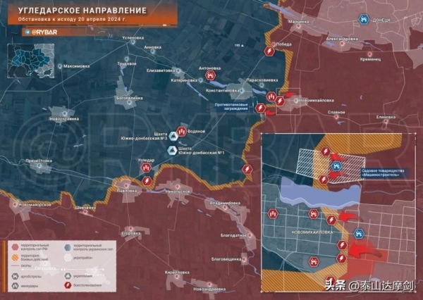 Rybar称,4月20日,在乌格莱达尔方向的新米哈伊洛夫卡发生战斗,凸显出俄军沿季米里亚泽夫街的推进情况。当天结束时,据报道,他们已经完全控制了该村。
