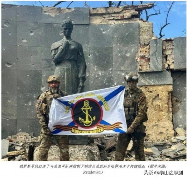 傍黑时分,第一张照片出现了:115海军陆战旅的队员们在新米哈伊洛夫卡西郊展示一张带有俄罗斯旗帜的照片。79空降旅最后一批基辅士兵最终被打出该村,据悉,该部队损失惨重。
