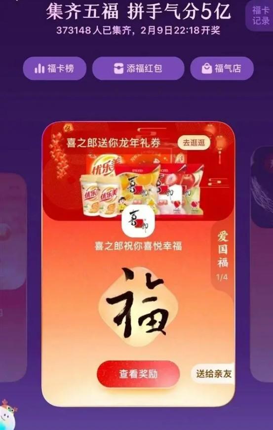 近年来活动更注重全民拼手气,基本上每个人都有机会集齐五福。例如,2022年有超过2.75亿人成功集齐五福,共瓜分5亿现金;而2023年则有超过2.66亿人参与,平均每人不到两块钱。