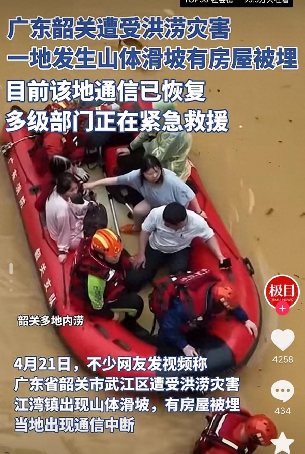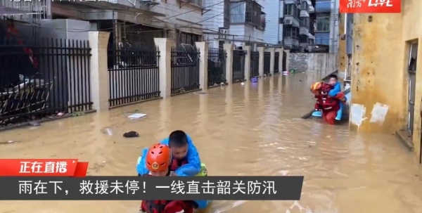 李女士则是一位在韶关市区一家花店工作的常职人员。虽然她所住的位置地势较高,暴雨对她的生活影响并不大,但周围地区的洪水困扰让她也深感无奈。 社会的反馈:这场罕见的洪灾得到了大众的广泛关注,社会各界也开始对此进行讨论。在社交媒体上,大部分人分享了他们由于洪水带来的麻烦和对未来的担忧。网友们普遍表示担忧,对近年来频发的自然灾害表示忧虑,并分享了各自的遭遇和感受,部分学校也开始停课。