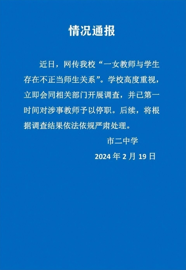 2月19日,学校和教育局都发布了通告,表示女教师已经被停职,目前事件还在调查中。