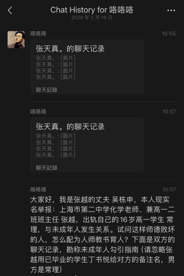 最近上海一中学女教师出轨16岁学生的事件在网络上持续发酵,引发社会关注。随着聊天记录的曝光,发现张某的聊天记录中,似乎还涉及到与往届学生的不正当关系。2月20日,当地教育部门回应称,目前此事仍处于调查阶段。