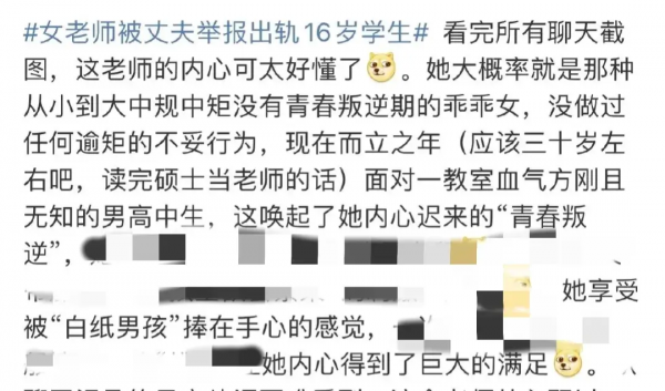 有位热心的网友针对聊天记录和过往经历,分析了女教师的内心,认为女教师年少时可能是乖乖女,现在的行为是一种迟来的叛逆。