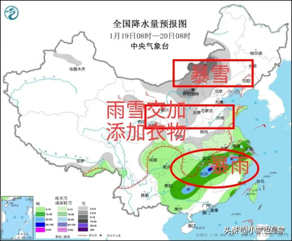 根据中央气象预报,当下天气既多雨又多雪。从 19 日开始的寒潮将会加强这些降水。在雨雪交加的天气里,甘肃的南部、陕西、宁夏、内蒙古、山西、河北、河南、山东半岛和湖北北部等地会经历雨转雨夹雪或小到中雪,局部地区的雪可能会相当大,给行人和车辆通行造成不便。而贵州、广西北部和江南北部等地则会有中到大雨,某些局部地区还可能会出现暴雨。