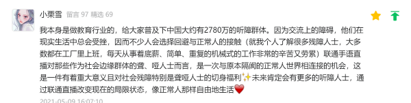 2021年5月17日,中国联通开启5Gⁿ视频客服手语直播,邀请中国聋协主席杨洋进入手语直播间做主题发言,呼吁社会各界关爱听障人士。直播预告信息发出后,评论区反响空前,粉丝们纷纷用自己的亲身感受,讲述着无声世界的故事。