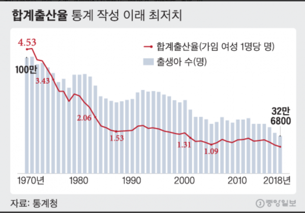 这种情况便导致了韩国的失业率极高,尤其是现在的青壮年。面对如此的经济大局势和自身的经济状况,抱着单身自由,单身经济压力低等"一人吃饱全家不饿"的思想,甚至存在对自己另一半和孩子负责的原因,导致当代韩国青壮年的结婚意愿低,并且结婚年龄偏高等情况。这种情况便大大降低了韩国的生育率,导致人口负增长。