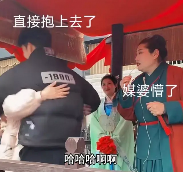 他毫不犹豫地走到姑娘身边,一把将她紧紧地抱在怀中。姑娘惊讶的表情立刻蔓延在脸上,旁边的媒婆也被这突如其来的举动吓到了,差点从椅子上摔下来。