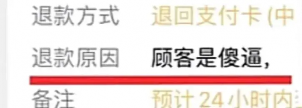 李先生注意到是杯沿变形所致服务员便联系服务员。该名服务员答应免单,到了当日下午,李先生确实收到麦当劳的退款到账通知,但是今他震惊且愤怒的是,其中退款原因一栏竟写着:顾客是傻x!!