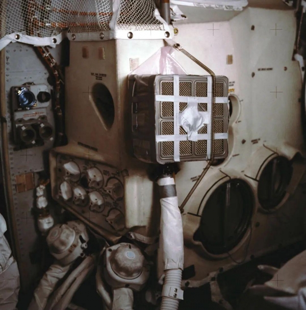 图中的盒子,是从指令舱取来的氢氧化锂模块,挂在登月舱内 | NASA