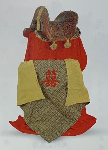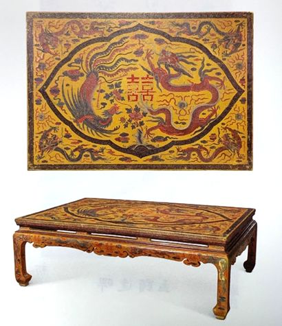 最后便是同牢合卺礼,夫妻双方共同食合卺宴。下图为婚礼时用的龙凤合卺桌。桌通体黄漆为地,桌面彩漆龙凤双喜纹,牙板上饰双喜云幅,整体造型规整,寓意吉祥。