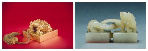 左图为故宫博物院藏清代“皇后之宝”,盘交龙纽;右图为螭纽