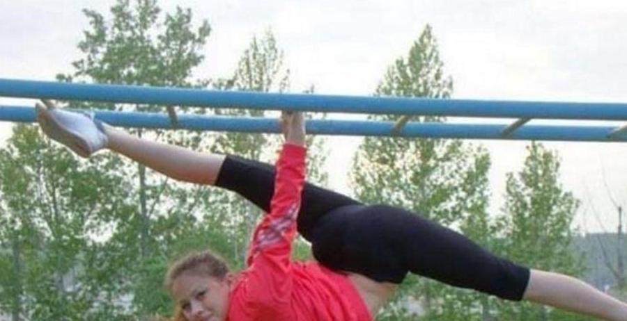 美女一边玩“一字马”,一边玩抓举,真是一举两得,玩出了创意。