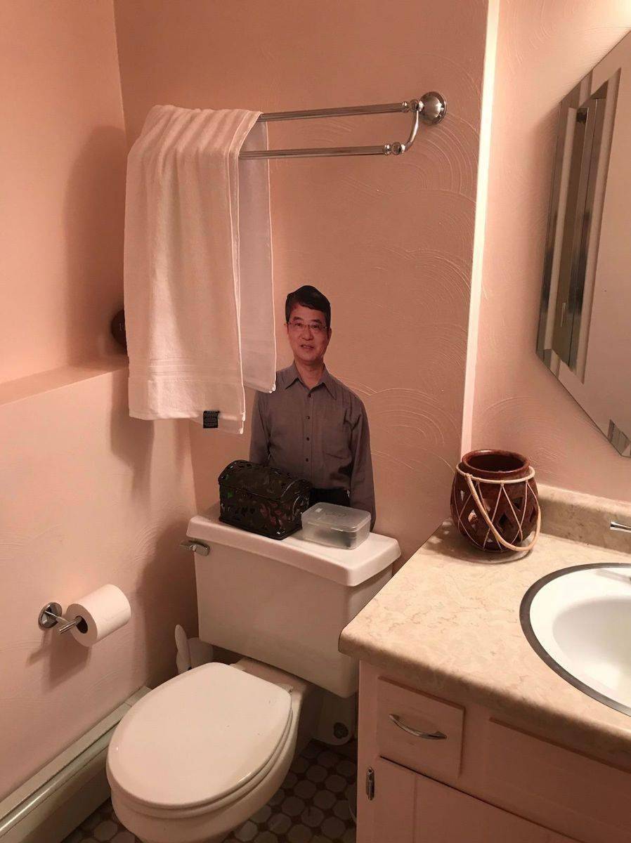 而且还贴在了卫生间的马桶后面!?这是什么神奇的操作...上厕所前对视一眼不尴尬吗...