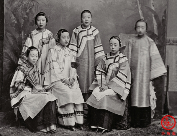 从人物的梳妆打扮来看,她们出身于经济条件优渥的家庭。她们穿着款式相近的袄裙或袄裤,很可能是同一个家族的姐妹。这样的衣服也是晚清很有代表性的女装。大家注意,前排两位女孩露出了小脚,小到几乎让人怀疑她们能不能稳稳地站起来。