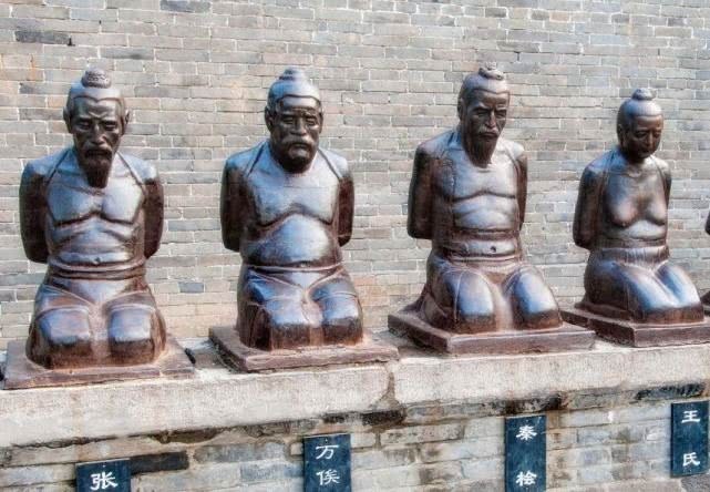 在杭州西湖岳飞墓前,有四个铁铸的真人般大小的跪像。一边是奸相秦桧和他的老婆王氏,另一边是奸臣万俟卨和张俊。