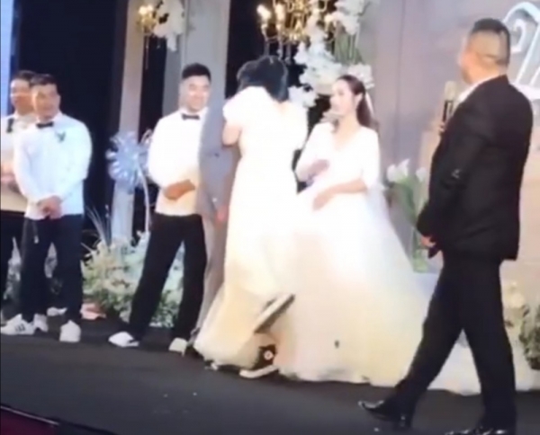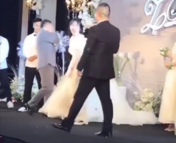 新郎吓得赶紧躲,但是伴娘并没有就此作罢,而是踮起脚,强行往新郎脸上吻了过去,伴娘当时的目标应该是新郎的嘴,但是新郎给躲开了,伴娘最终只吻到了新郎的脸。