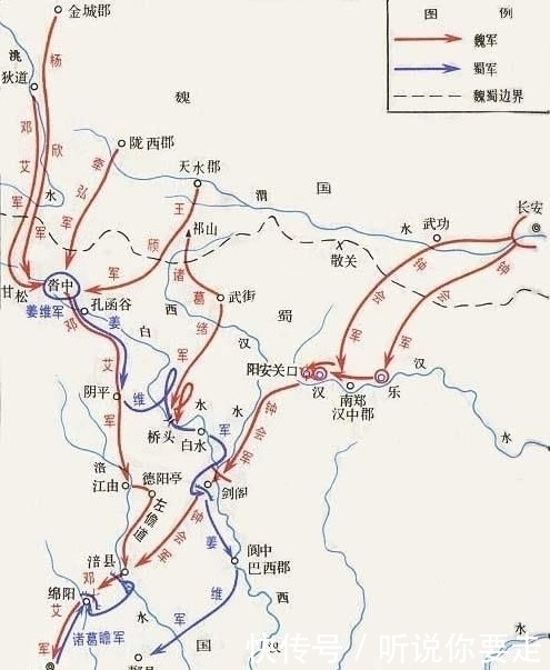 艾上言:"今贼摧折,宜遂乘之,从阴平由邪径经汉德阳亭趣涪,出剑阁西里,去成都三百馀里,奇兵冲其腹心。剑阁之守必还赴涪,则会方轨而进;剑阁之军不还,则应涪之兵寡矣。军志有之曰:'攻其无备,出其不意。'今掩其空虚,破之必矣。"