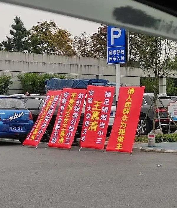 根据网友随帖子发布的图片显示,有人在公开场合拉出四幅红色条幅指称“安徽大学团支书王某某插足婚姻当小三……请人民群众为我做主。”