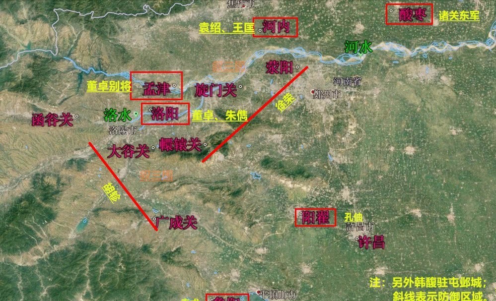 由此可知,东南防区可抵挡从酸枣或者阳翟方向入侵的关东军(如徐荣在汴水阻击曹操);西南防区可抵挡从鲁阳方向入侵的袁术军队(如胡轸与孙坚阳人之战);北部防区可抵挡从河内方向入侵的袁绍、王匡军队(如董卓偷渡小平津,袭击河阳津王匡部队)。