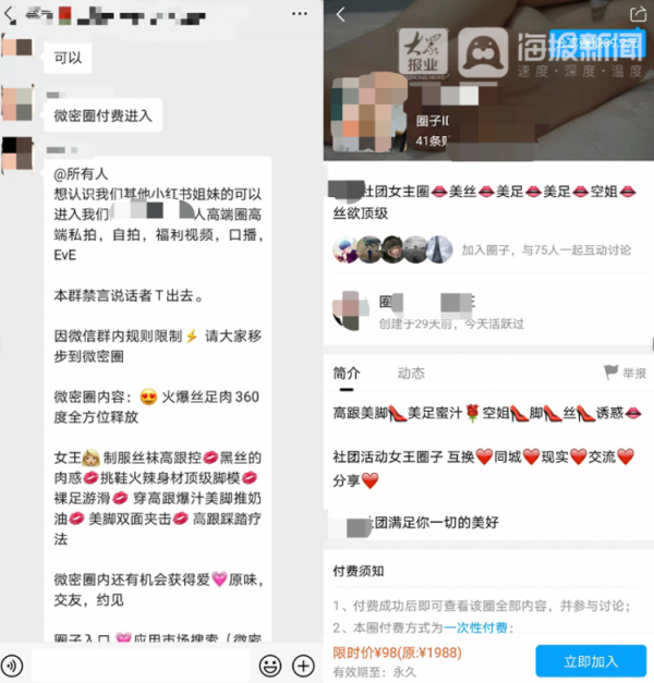 记者加了小红书某博主微信后,该名博主将记者拉入了一个微信群,群主@所有人称,“想认识其他小红书姐妹的可以进入某某社团私人高端圈。”其介绍高端圈有高端福利,包括高端私拍、自拍、福利视频。进入圈子后,还可以在圈内私信所有女主加私人微信。该群主表示群内不要说话,想交流需要下载微密圈APP进入社团。