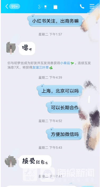 除了引流到其他社交平台,记者还发现部分博主会借助小红书APP进行某些灰色交易。记者联系某小红书博主,询问其是否接北京、上海等地的高端商务约会,随后收到该名博主的肯定回复,当记者表示是否可以加其微信好友时,该博主称,需要先发红包才可以加好友。